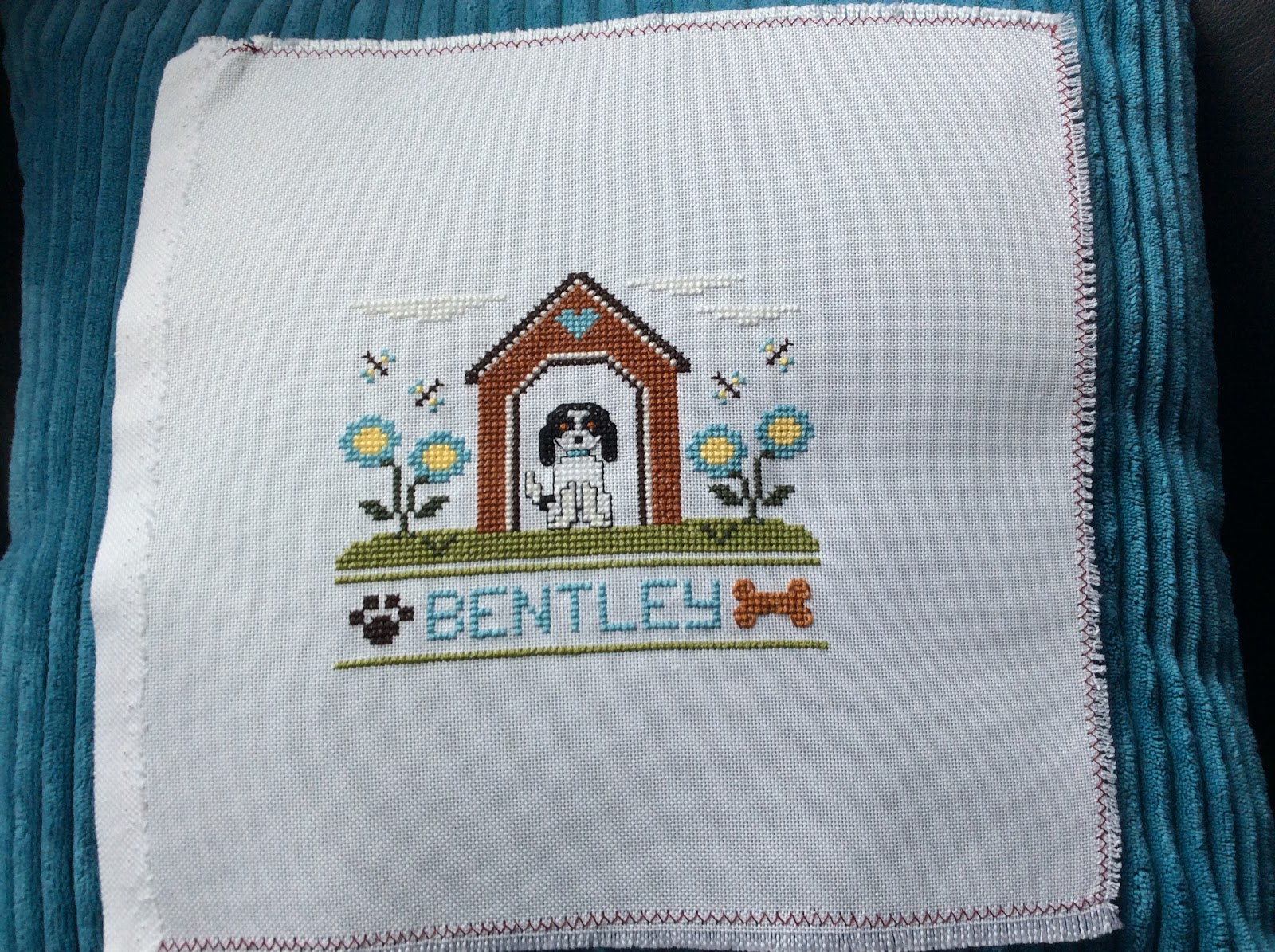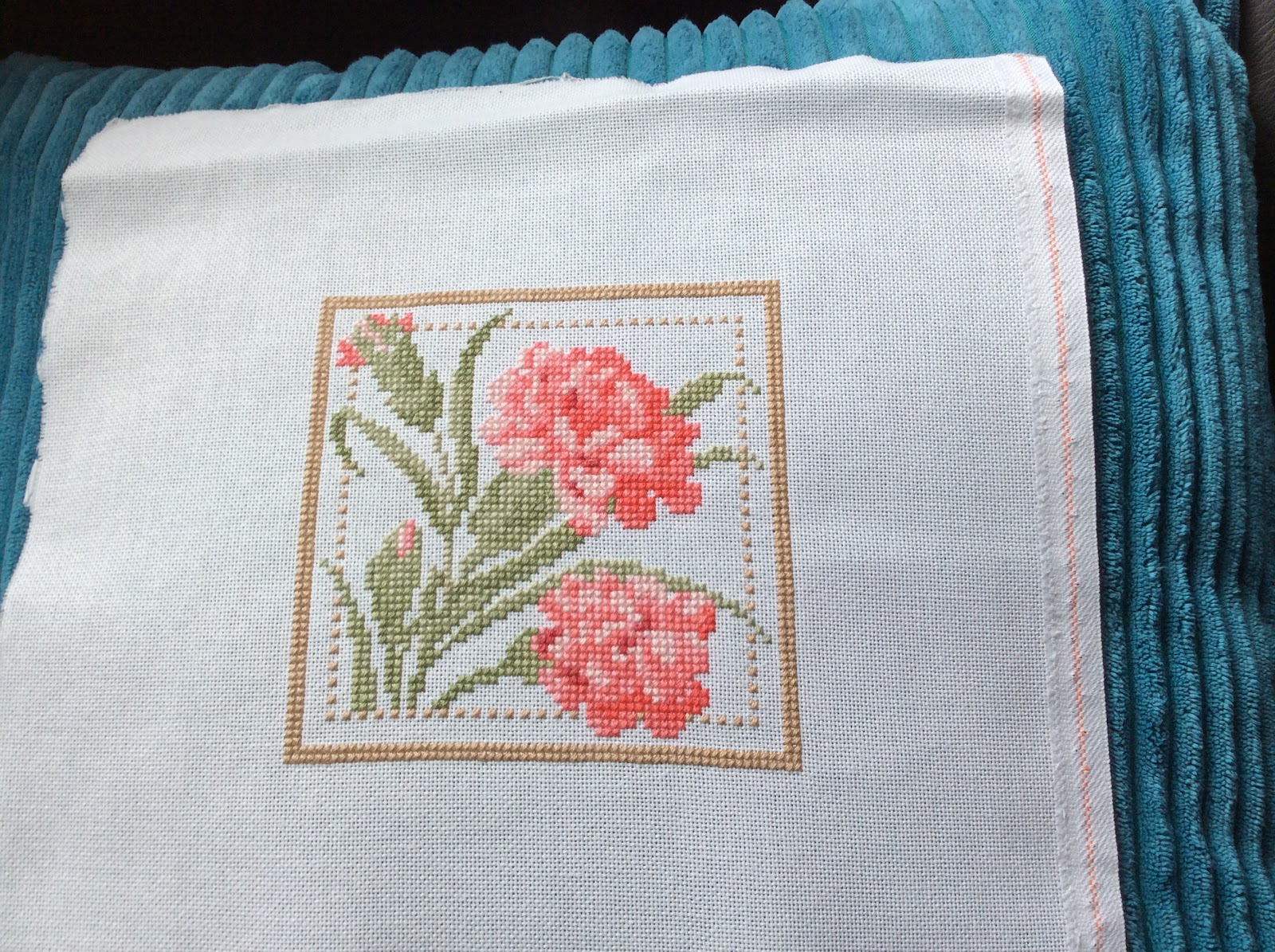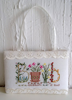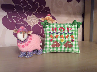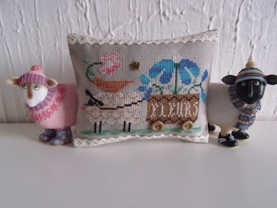 Before I kitted up my new start I decided to stitch the Hop Squared design by Lizzie Kate that I had just bought. As I was looking through my stash for a backing fabric I came across this pretty green one and I thought maybe I could have a go at stitching the design on this. I had a piece of waste canvas that I bought about 15 year ago and had never used. I was rather anxious and worried that it would be all wonky when I took the pins off but I'm (blushing) really rather pleased with myself. I spent Friday night making it up into this little pillow.