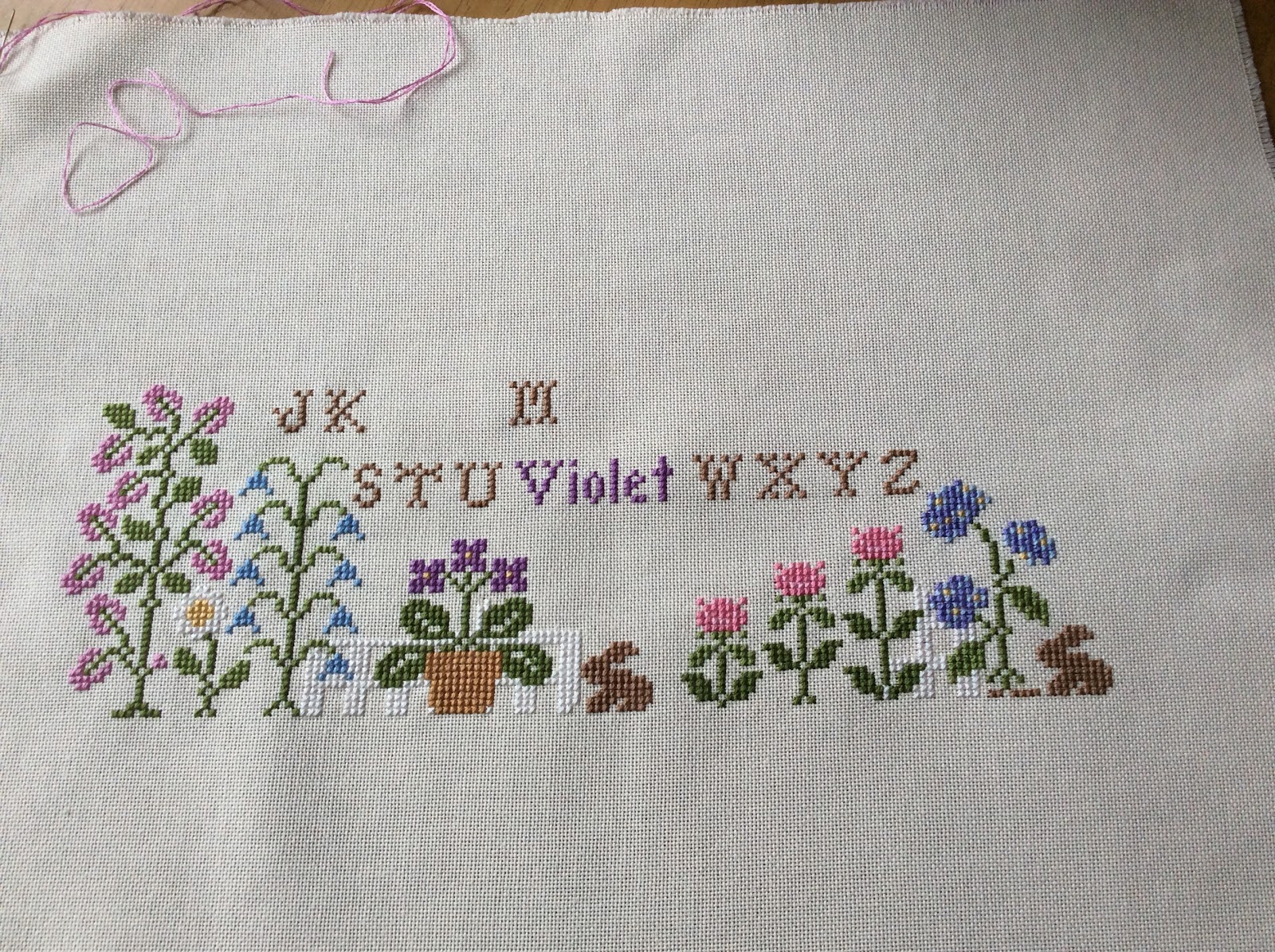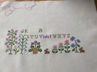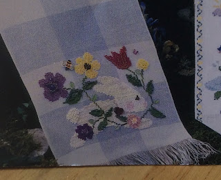 Now to my stitches I'm afraid I'm not a very happy bunny as I noticed midweek when I took this photograph of the progress on my Summer Garden I had miss-counted. To the right of the bunny in the middle all the way along those pretty flowers and the other bunny are stitched one hole up from the bottom. I thought at first it was just my fabric that was making the line uneven then I saw my mistake...ggggrrrrrhhh!!! It has gone back in the box until I can bring myself to look at it again.